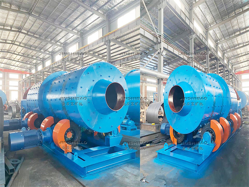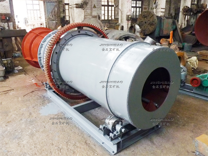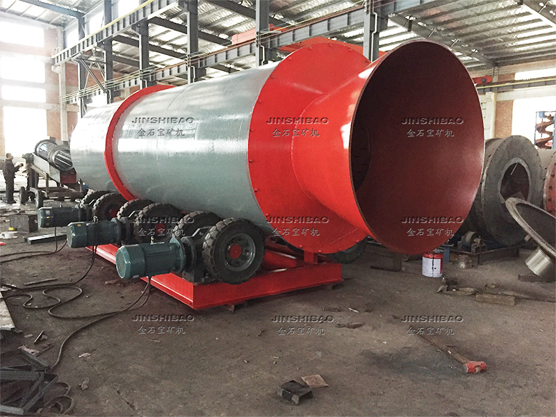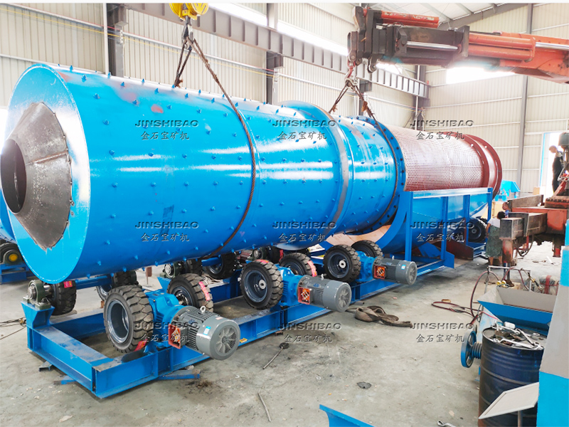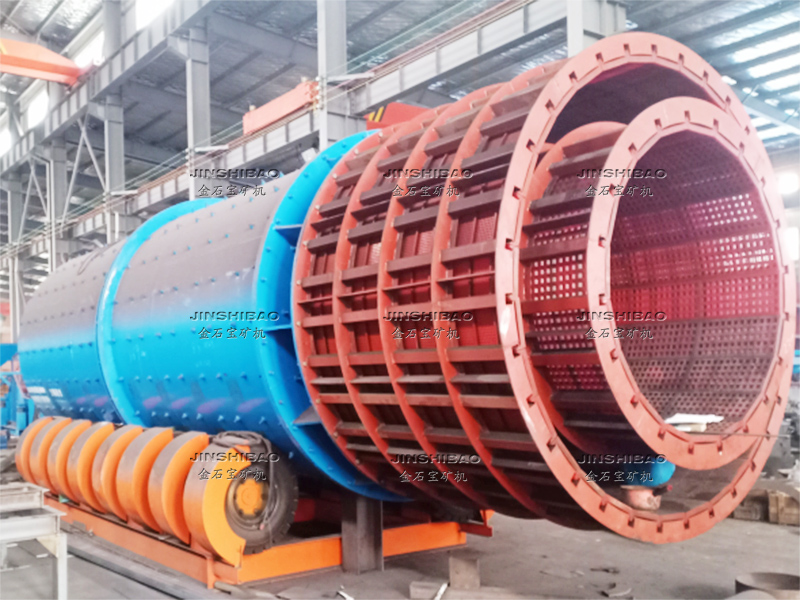滚筒洗矿机的筒体由四个滚轮支撑,电机带动减速机传动,大小齿轮带动清洗筒体低速旋转。含有泥团或石粉的物料从进料口给入,进入旋转的滚筒内,清洗滚筒内壁安装有一定角度的搅拌叶片,同时物料不断被带起抛落,自进料端到出料端移动过程中多次循环,并被顺向或逆向的高压冲洗水冲刷洗涤,清洗干净的物料经过尾部出料端筛分脱水后排出,从而达到洗矿、筛分、脱泥作业。