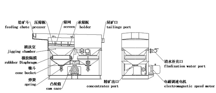 设备主要由:给矿斗、跳汰室、压筛框、筛网、承筛框、锥斗、橡胶隔膜、弹簧、凸轮箱、电磁调速电机、清水补充口、精矿口、尾矿口等构成。